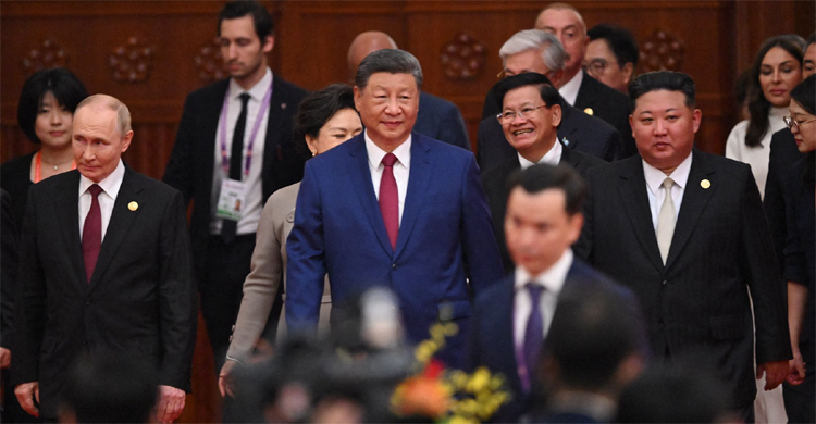 সে সময় অভূতপূর্ব এক দৃশ্য চোখে পড়ে। তিয়ানমেন স্কয়ারে কিম এবং পুতিনের সঙ্গে হাত মিলিয়ে গল্প করতে করতে রেড কার্পেটের ওপর দিয়ে হেঁটে যাচ্ছেন শি জিনপিং।