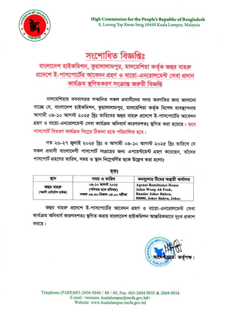 সংশোধিত বিজ্ঞপ্তিতে বলা হয়, গত ২৬ ও ২৭ জুলাই অনিবার্য কারণবশত সেবা কার্যক্রম স্থগিত করা হয়। এর পরিবর্তে ৯ ও ১০ আগস্ট জোহর বাহরু অগ্রণী রেমিট্যান্স হাউজ সেবা কার্যক্রম পরিচালিত হবে। যেসব প্রবাসী বাংলাদেশি পাসপোর্ট সংগ্রহের জন্য, গত ২৬-২৭ জুলাই ২০২৫ ও ০৯-১০ আগস্ট অ্যাপয়েন্টমেন্ট গ্রহণ করেছেন, তাদের পাসপোর্ট শনি ও রোববার স্থানীয় সময় সকাল সাড়ে ৯টা থেকে বিকেল ৪টার মধ্যে পাসপোর্ট সংগ্রহ করতে পারবেন বলে বিজ্ঞপ্তিতে উল্লেখ করা হয়।