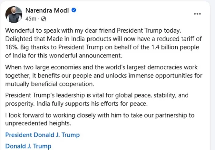 সোমবার (২ ফেব্রুয়ারি) রাতে সামাজিক যোগাযোগমাধ্যম এক্স ও ফেসবুকে এক পোস্টে নরেন্দ্র মোদী লেখেন, ‘আজ আমার প্রিয় বন্ধু প্রেসিডেন্ট ট্রাম্পের সঙ্গে কথা বলতে পেরে আনন্দিত। ভারতে তৈরি পণ্যের ওপর এখন শুল্ক কমিয়ে ১৮ শতাংশ করা হয়েছে জেনে আনন্দিত। এই দারুণ ঘোষণার জন্য ১৪০ কোটি ভারতবাসীর পক্ষ থেকে প্রেসিডেন্ট ট্রাম্পকে অনেক ধন্যবাদ।’