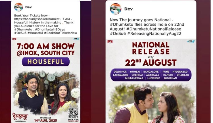 সেই উত্তেজনার মাত্রাকে আরও কিছুটা বৃদ্ধি করে দিয়েছিল ‘ধূমকেতু’র ট্রেলার লঞ্চ ইভেন্ট। সেখানেও প্রায় ১০ বছর পর নিজেদের মধ্যে থাকা সব মান-অভিমান শেষে একসঙ্গে, এক মঞ্চে এসে হাজির হন দেব-শুভশ্রী। একসঙ্গে নাচও করেন, আড্ডা দেন। সব কিছু মিলিয়ে ‘দেশু’ ভক্তদের উৎসাহ দারুণভাবে বৃদ্ধি পায়। আর সেই প্রভাব বক্সঅফিসে স্পষ্ট। যেন ছবি মুক্তির আগেই হিট। তাই হলে, প্রেক্ষাগৃহে অগ্রিম টিকিট বুকিংয়ের নতুন নতুন রেকর্ড গড়েছে।