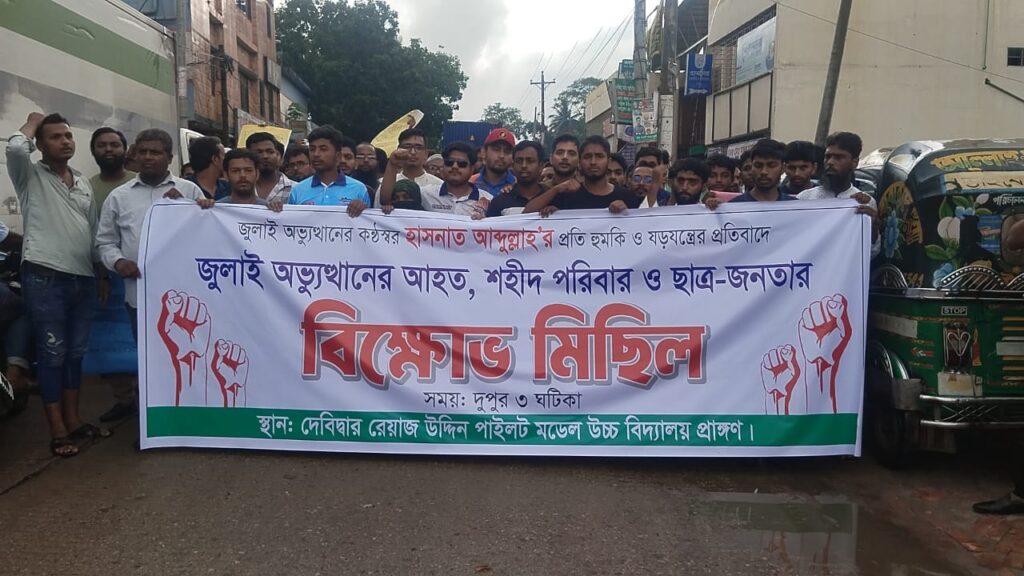 হাসনাত আবদুল্লাহর প্রতি হুমকি ও ষড়যন্ত্রের প্রতিবাদে কুমিল্লা দেবীদ্বারে বিক্ষোভ মিছিল করেছেন জুলাই অভ্যুত্থানের আহত, শহীদ পরিবার ও ছাত্র-জনতা।